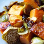 Roast winter veggies: Kabocha squash, cauliflower and brussels sprouts with fresh herbs: rosemary, sage and thyme for a fragrant healthy delicious low fat high fiber side dish. Easy! Just chop & bake.