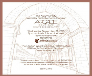 The Autumn Party promises a fantastique runway fashion show and cocktail party that will put you in the autumn spirit amidst striking views of Hollywood and Beverly. Join us for the show, silent auction, cocktails and hors d’oeuvres. Hosted by Rochelle Gores Fredston and Arcade Boutique. For tickets and more info, call 213.807.1959 or go to http://www.childrensinstitute.org/events/details/40
