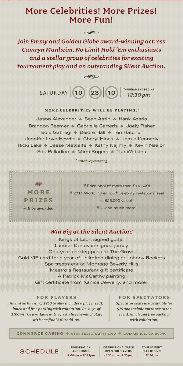I can personally attest that last year’s tourney was a blast! Got to play with Neil Patrick Harris, Jose Canseco, Jennifer Love Hewitt, Allison Sweeney, Jamie Kennedy, host Camryn Manheim… Over 30 celebs have RSVP’d already for this year’s event and a prize pool of more than $15,000, including a seat at the 2011 World Poker Tour Celebrity Invitational!