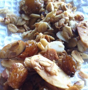 Using a base of nuts, seeds and slow cook oats, who haven’t been robbed of their fiber (the problem with instant oats, rice, etc), this sweet crunchy granola provides 3 grams of fiber and 6 grams protein per 1/3 cup serving. We’ve also reduced the amount of oil, and thus saturated fats, traditionally used in granola. Fortunately, the fat that remains is the healthy naturally-occurring monounsaturated fat and Omega 3s found in the nuts and seeds. In a world where sugar is frequently the second ingredient in most cereals (or organic evaporated cane juice), it’s tough work making a healthy low-sugar alternative that also tastes sweet. I choose the natural sweetness of honey, using a drastically reduced amount for a recipe this size, and calorie free stevia. Adding a generous amount of fresh lemon juice helps further up the sweet content and enhance the flavor of ginger, my favorite spice.