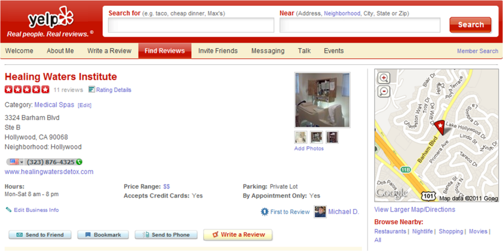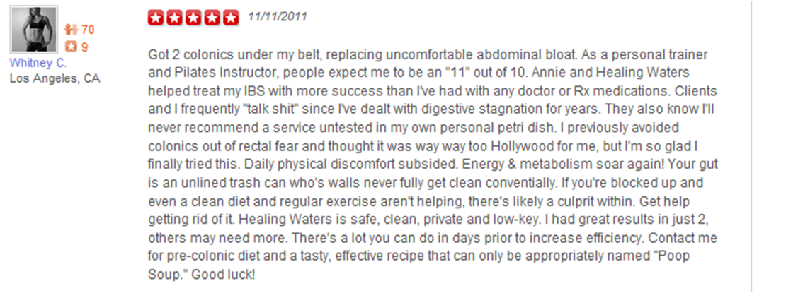 Since I constantly get inquiries about colonics, I’m posting my Yelp review of Healing Waters hydrotherapy.