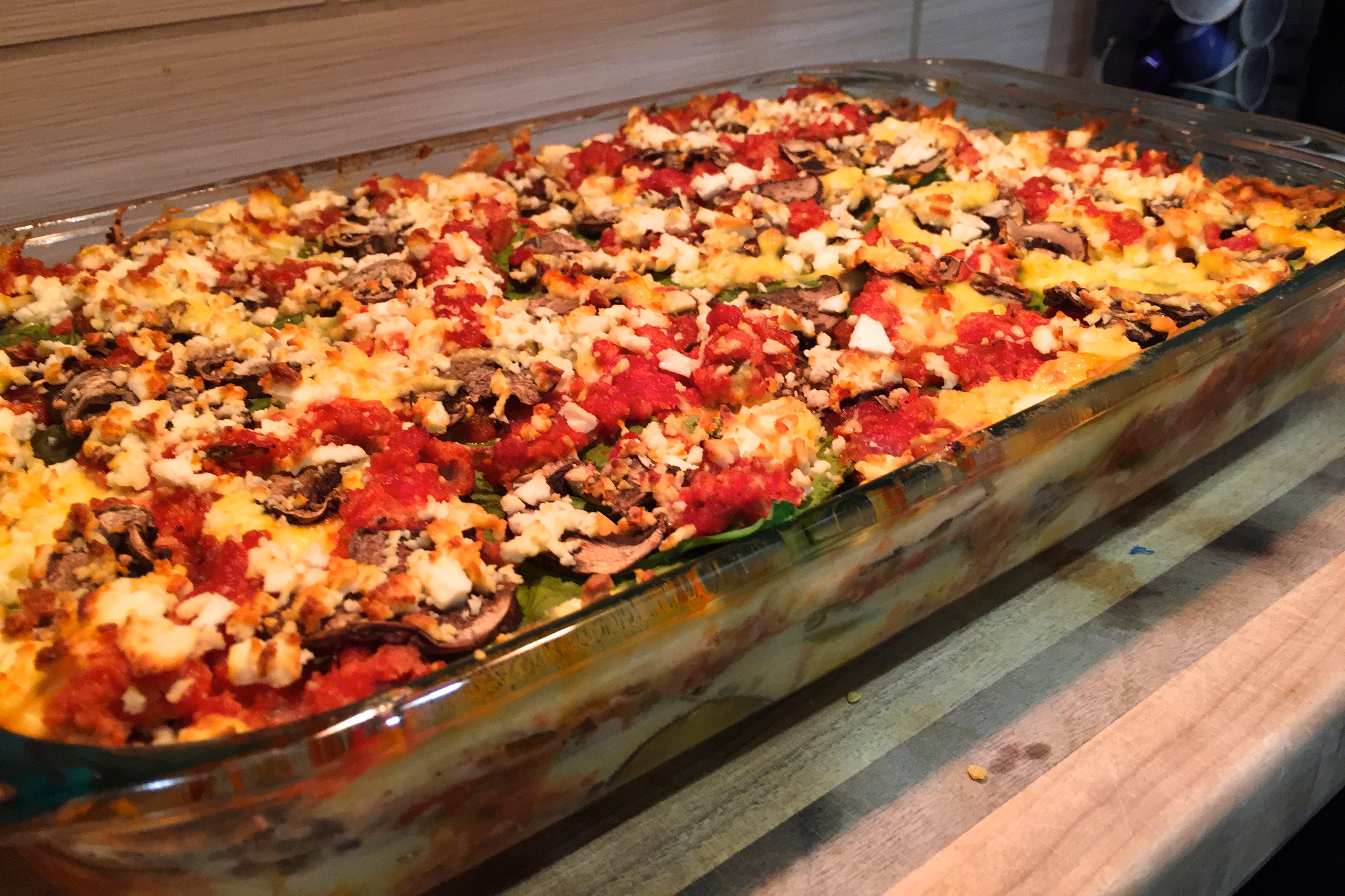 Assembly. Spray 13×9” glass pan. Layer bottom with 4 gluten free lasagna sheets, layer of meat sauce, cheese mixture, half of eggplant, half the spinach leaves, meat sauce, cheese mixture. Repeat all 7 layers. See Lasagna Layer diagram. This should make a lot more sense to the 97% of us who are visual learners! Fnally sprinkle top with crumbled feta.