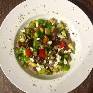 Having been so spoiled, I’m quick to spot a fraudulent Greek Salad when I see it! Skip the faux Greek salad in most restaurants and grocery stores. Tossing a bowl of pale, oil-doused iceberg lettuce with a few black olives and chunks of hard feta doesn’t make a Greek salad. Instead, try this traditional Greek Village Salad with added garbanzo beans for protein. Notice there’s no lettuce in this recipe? That’s not an error. Traditional Greek salads do not contain lettuce, especially not iceberg which is merely a cheap, nutrient-devoid filler in many restaurants.