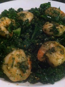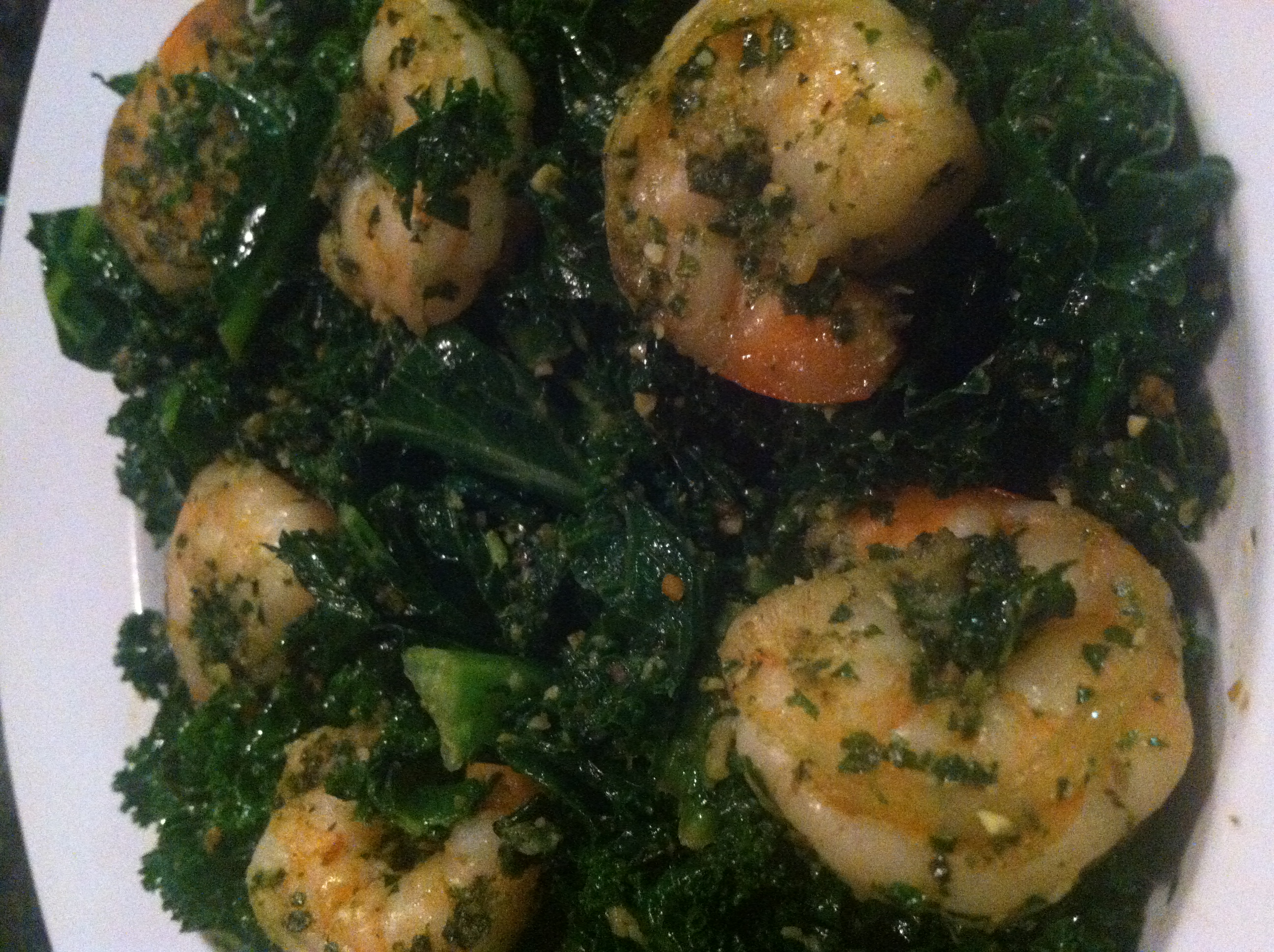 Who doesn’t love a big bowl of pasta? Tonight, here’s permission to guiltlessly stuff yourself with a huge bowl of rich, garlicky, herby pesto coating every ridge of beautiful large pink prawns and…kale? Pasta, bread, rice, etc are a starchy vehicle for us to enjoy the delicious flavor of sauces and toppings with whom we pair them. Trade the pasta for kale and you’ll lose several hundred nutritionally devoid tummy-tire pumping calories, and add the nutrition benefits of kale! A rich source of Vitamins A and C, calcium, folic acid, magnesium, and packing more fiber per ounce than any other green, kale truly lives up to the “superfood” claims it’s been receiving!