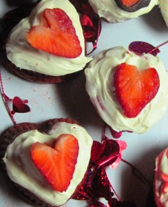 In stand mixer, blend coconut oil, eggs, stevia, protein powder & vanilla. Alternately add gluten free flour mixture & buttermilk until mixed. Add food coloring, blend until evenly distributed. Pour into prepared muffin tin or baking cups (on cookie sheet) and bake 12 minutes. Shake pan before removing. Cupcakes are cooked when they don’t jiggle. Yields 15 cupcakes. When the cupcakes have completely cooled, frost with Cream Cheese Frosting and decorate with unsalted nuts and fresh berries. A strawberry makes a perfect heart shaped topper. First, cut off the leaves and stem and very top of the berry. Then cut in half vertically and nip a V-shape out of the top center in each half (see pictures).