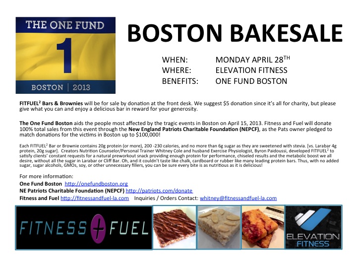 Truly horrified by the recent events in Boston, and thus feeling compelled to do something to help… For the past few months, Byron and I have been developing a healthy protein bar from all natural ingredients and whey protein. We felt like having a bakesale benefitting Boston’s victims was the perfect cause to showcase our snacks.