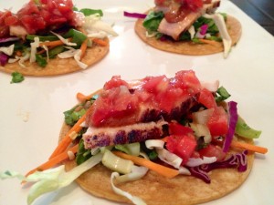 Warm the tortillas in a non stick pan. Use a teaspoon of Trader Joes’ Avocado’s Number One Guacamole and spread onto each tortilla. Top with the Thai slaw and a few pieces of albacore. Top with some of the sauce and some Pico. Enjoy!