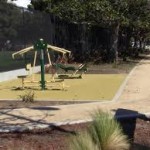 Playground offers a wide variety of exercise options: pull up bars, rings, parallel bars, climbing ropes, balance beams, open grassy areas, steps and boxes. With a gymnastics background, this is dreamland, but average joes can have fun too. Try doing inverted rows from a low bar while keeping your feet on the ground. For the more advanced, do pull ups or even muscle ups on the high bar. Try racing a friend to the top of one of the climbing ropes, work on core and balance on the balance beam, do some plyometric jumps onto the boxes or steps or take in some yoga and stretching on the grassy area.
