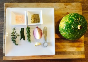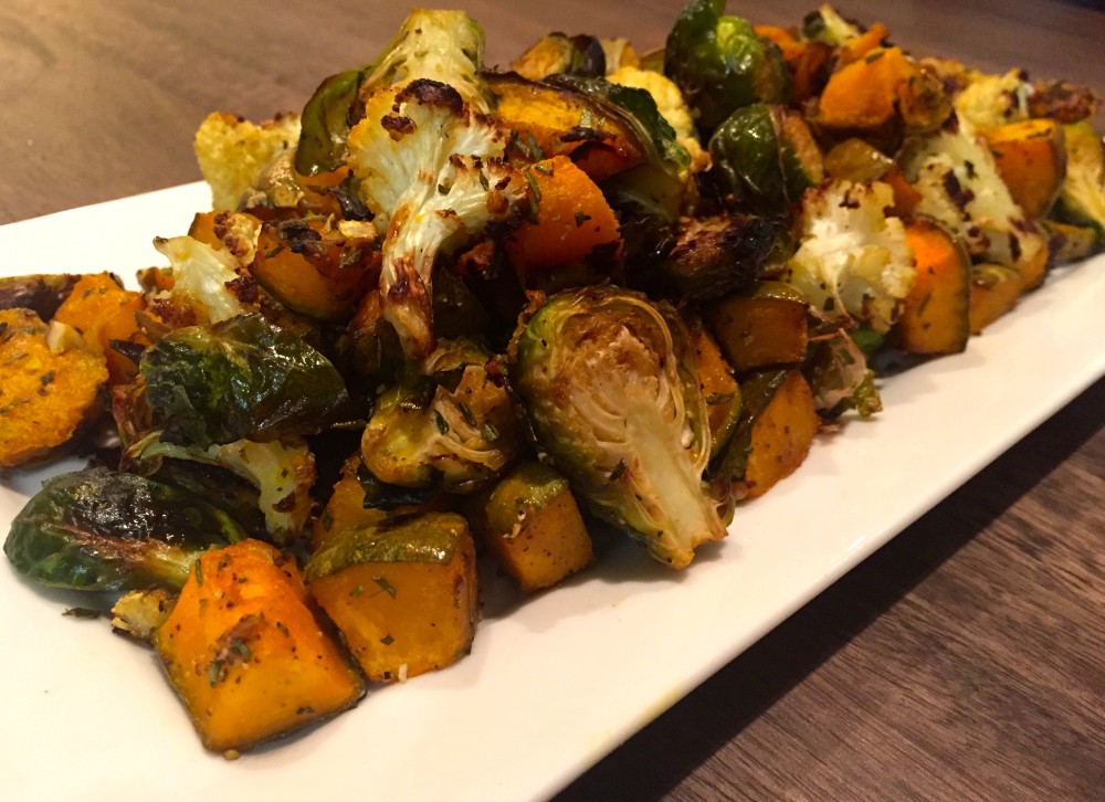 Prep Veggies. Carefully open squash. Remove and discard seeds. Chop kabocha squash into 1 – 1 ½ inch cubes and place in large bowl. Similarly, chop cauliflower into cubes. Chop Brussels sprouts in half. Place veggies in bowl with squash. Toss a few times with hands to mix. Add coconut oil and continue tossing with hands to distribute. Finally, add herbs, pepper and salt, and toss. Arrange veggies in a thin layer on both baking sheets. Roast 15 – 20 minutes, or until outside of veggies crisp and brown to your liking, while inside remains soft.