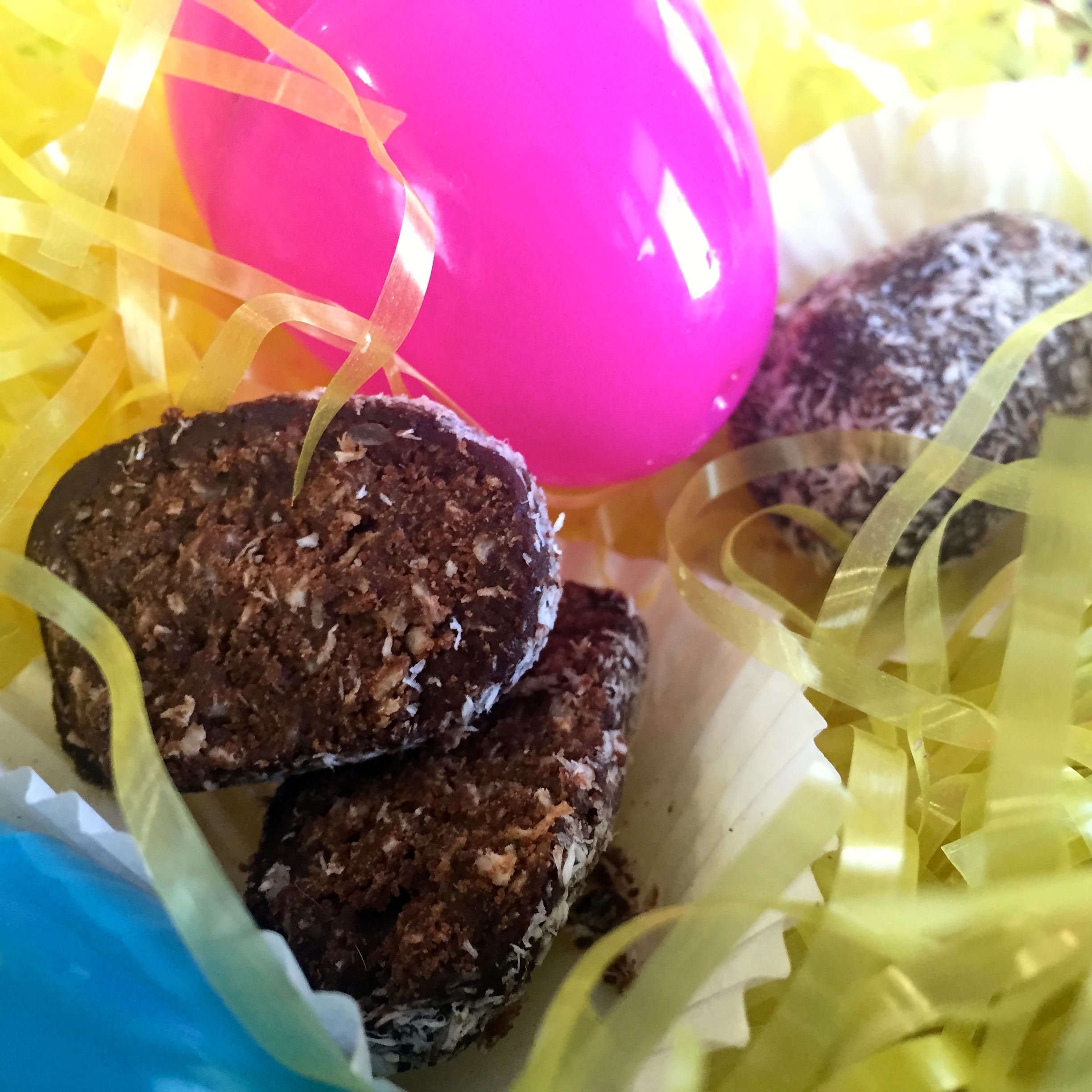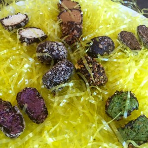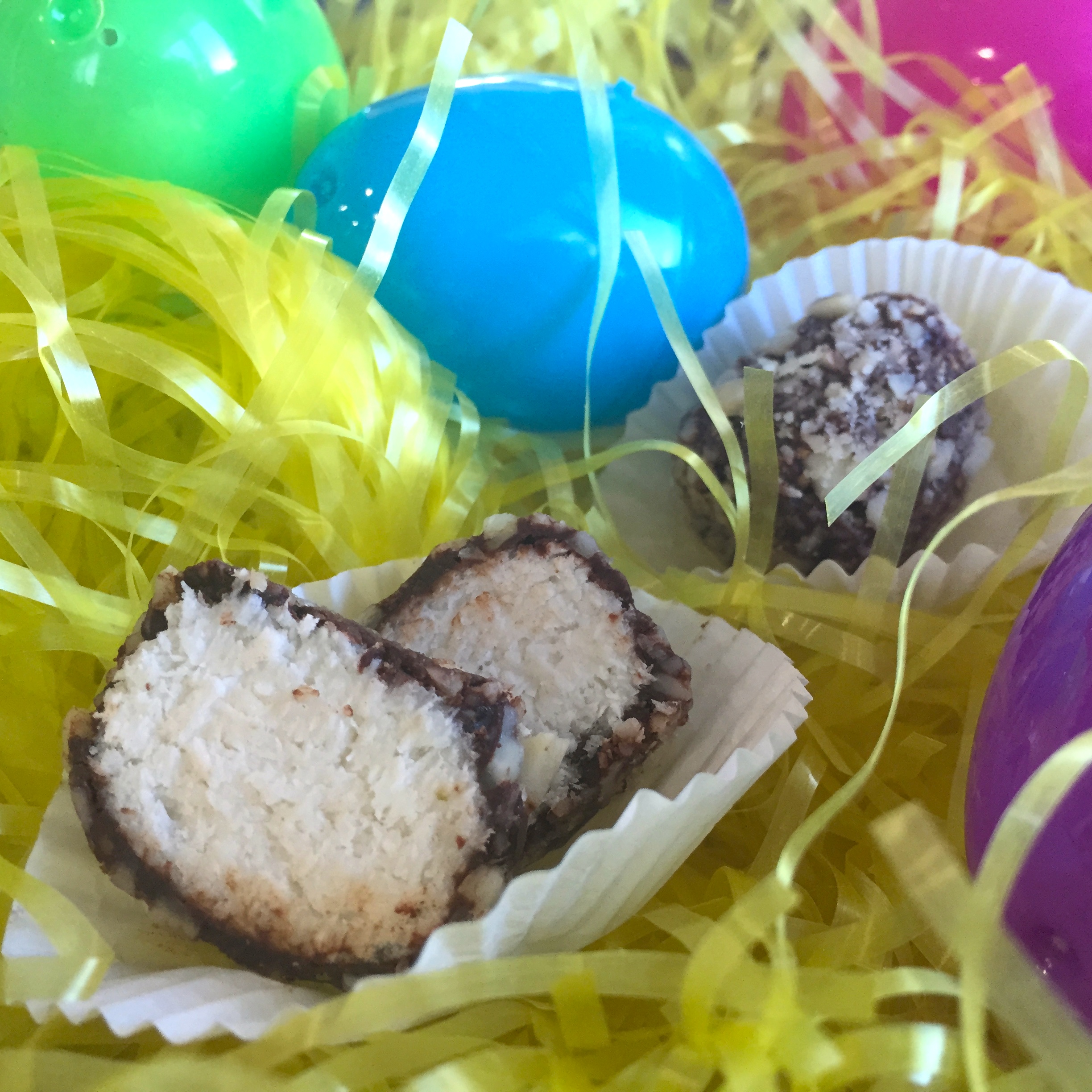 Gently roll each egg in chocolate mixture to coat. Remove with slotted spoon or fork. Roll chocolate covered egg in topping listed, or your own concoction. Carefully place truffle eggs on wax paper lined plate. Refrigerate until solid. Because coconut oil melts at room temperature, best stored in airtight container in fridge.