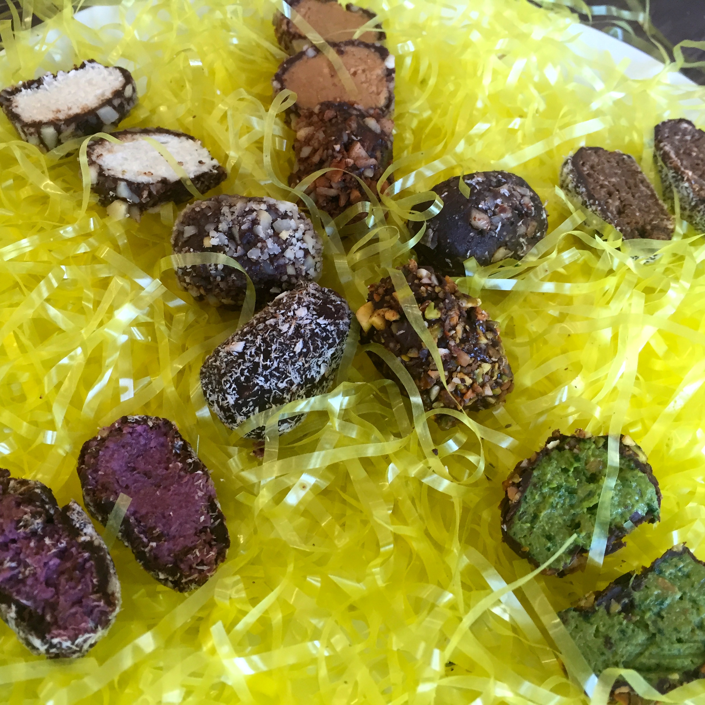 Tempted/Tormented by the chocolate bunnies, Peeps, Cadbury Creme Eggs…etc hoppin’ round stores, friends’ homes, employee break rooms…? Just in time for Easter, here’s a guiltfree recipe for high protein, refined sugar & gluten free, vegan truffles that will satisfy your sweet cravings!