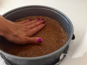Prep 9” springform pan. Remove ring + place parchment paper on bottom. Reposition ring + clamp shut. Very lightly grease side of pan with coconut oil. Center pan on a large piece of aluminum foil + fold excess foil up around side of pan. Place foil wrapped pan onto rimmed baking sheet or flat roasting pan. Set aside.