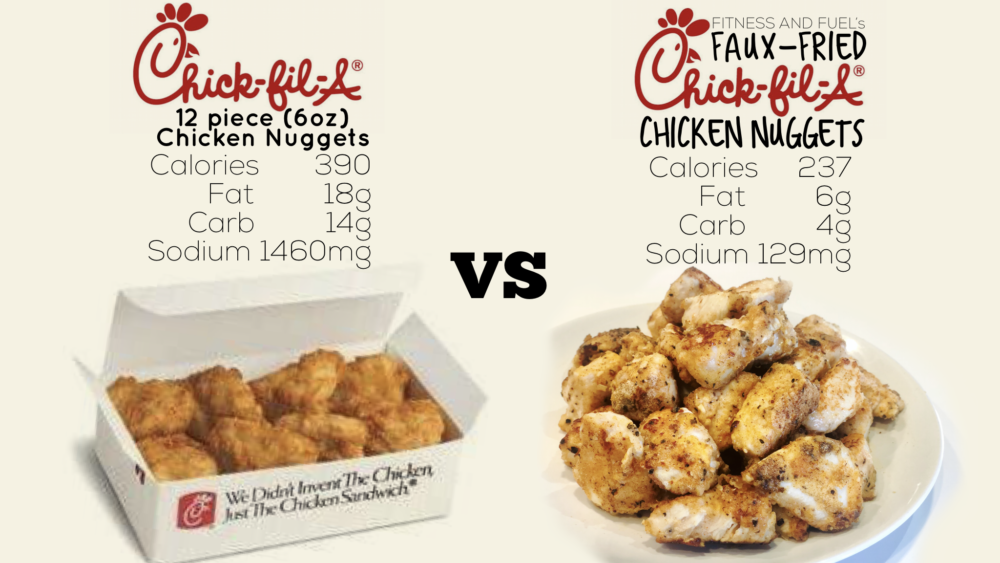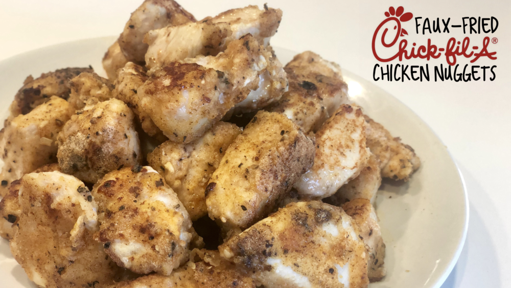 Quickly transfer chicken to oiled pan. Cook two minutes, then gently turn each piece. After another 2 minutes toss pan a few times + check to ensure cooked through (no pink)! Transfer cooked chicken to plate + DEVOUR!!! Serves 4 (6oz servings). NUTRITION INFO – 6oz F+F Faux Fried Chicken Nuggets 237 Calories / 6g Fat / 4g Carb / 39g Protein / 129mg Sodium Chick-Fil-A Chicken Nuggets (12 piece box) 390 Calories / 18g Fat / 14g Carb / 41g Protein / 1460mg Sodium