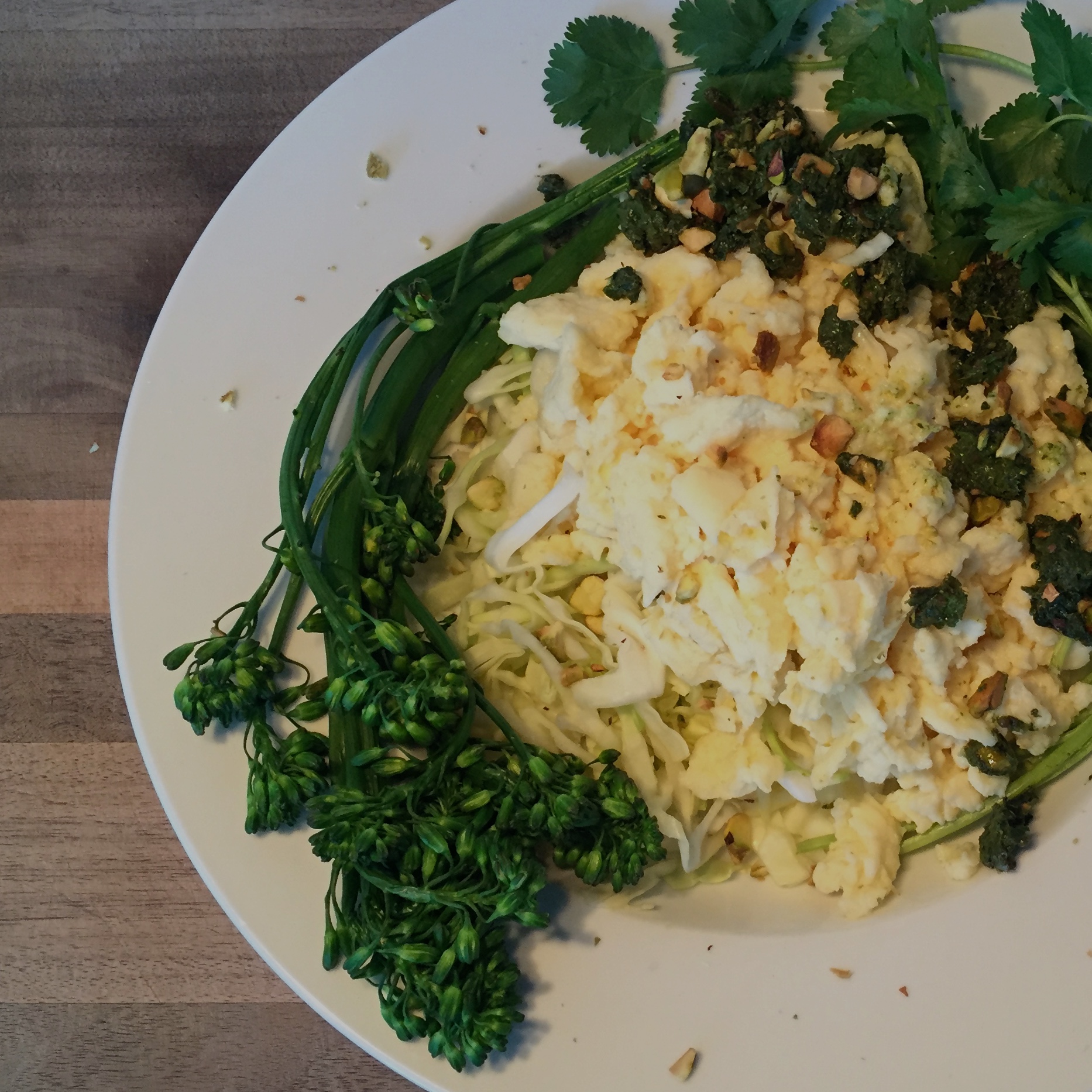 Elevate a high protein high fiber breakfast of egg whites, tender broccolini and cabbage with flavorful alkaline balancing herbs and a nutty low fat pistachio pesto. 25 grams protein, but only 244 calories + 9 grams fat! Paleo. Gluten, grain and dairy free.