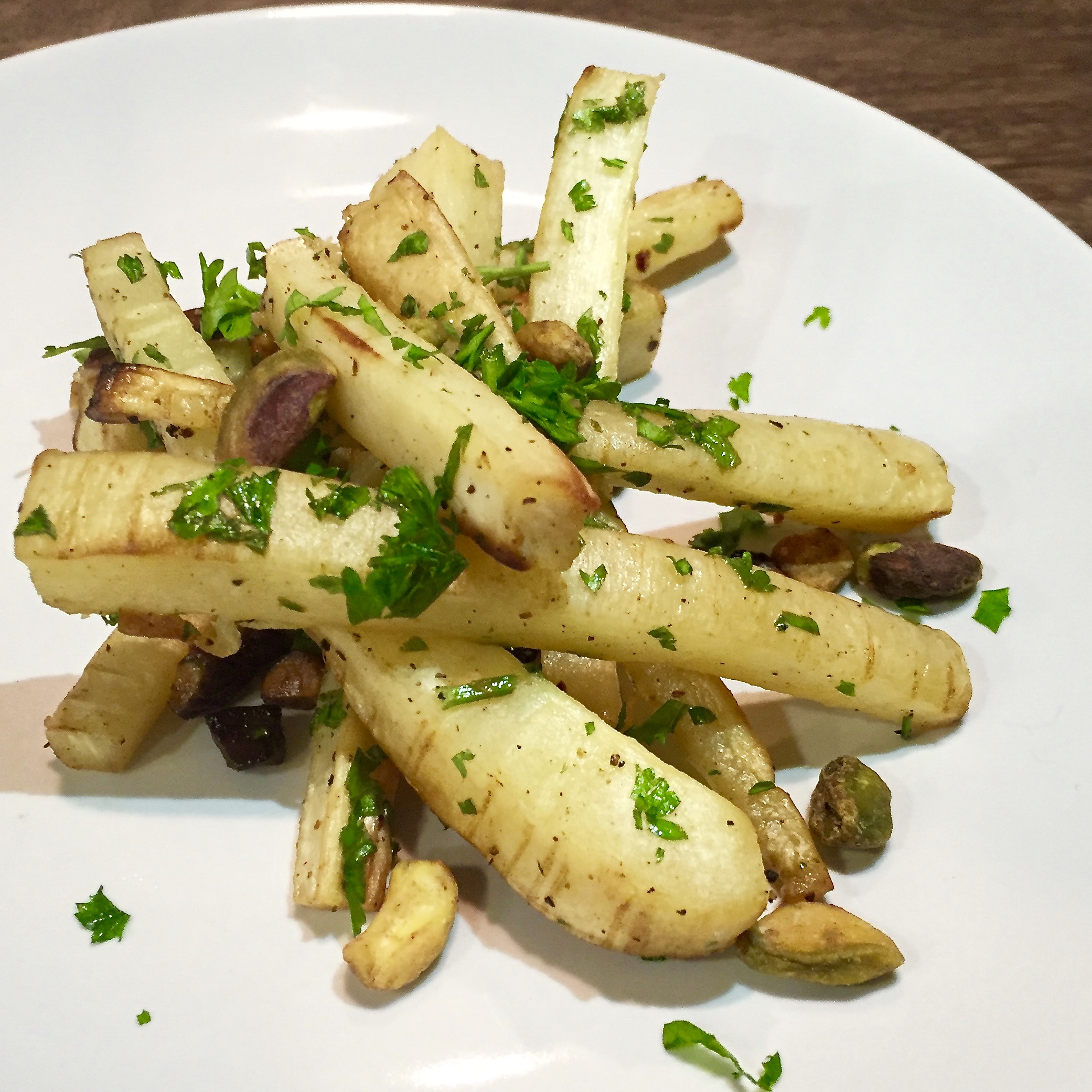 Bored with potatoes? Try our Roasted Parsnips! Enlisting complementing flavors of fresh lemon zest and juice, parsley and pistachios, this dish uniquely balances sweet, salty, sour and umami. Delicious with any protein.