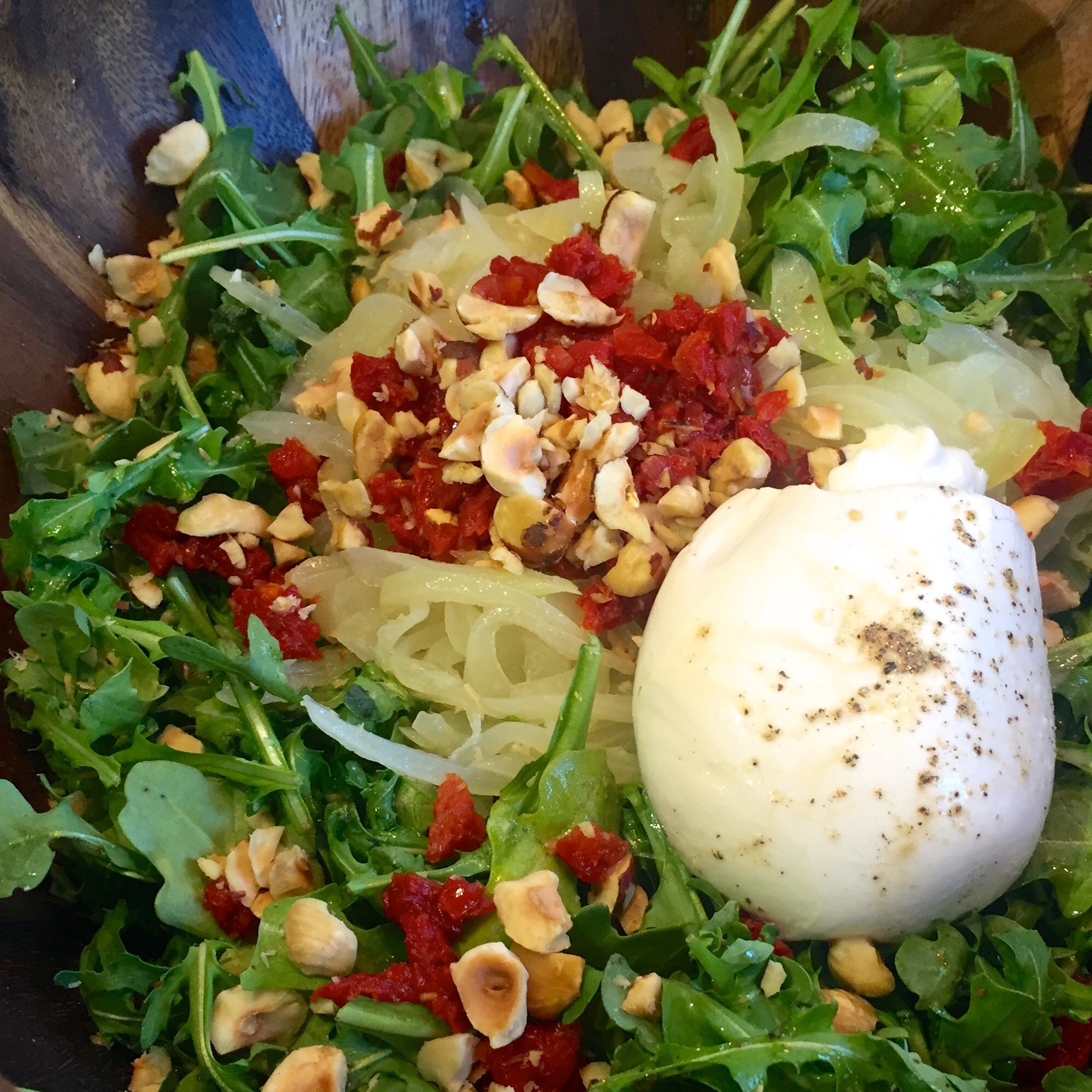 You want pizza? Watching your calories, fat and sodium? Me too! Enjoy classic Italian flavors of Pitfire Pizza’s Burrata Pie – tomato sauce, pesto, caramelized onions, hazelnuts and yeah, delicious creamy burrata mozzarella cheese in this exquisite salad. Cut 537 calories, 35g fat, 58g carbs and 90% of the sodium!
